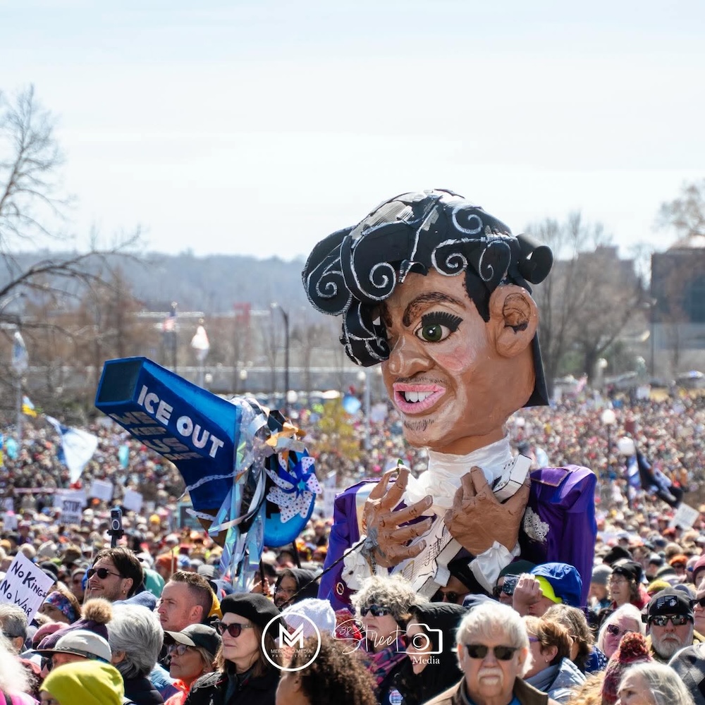 Just recently, I finished a giant Prince papier-mâché puppet sculpture that I did for the No Kings protest in St. Paul. Our team also created a giant whistle (project led by Jen Deforest) to represent the Whistle Brigades that were out during Operation Metro Surge alerting people to ICE presence. Our team also created a giant Rebel Loon (project led by Connie Maertz Kasella) to represent the Minnesota Resistance.